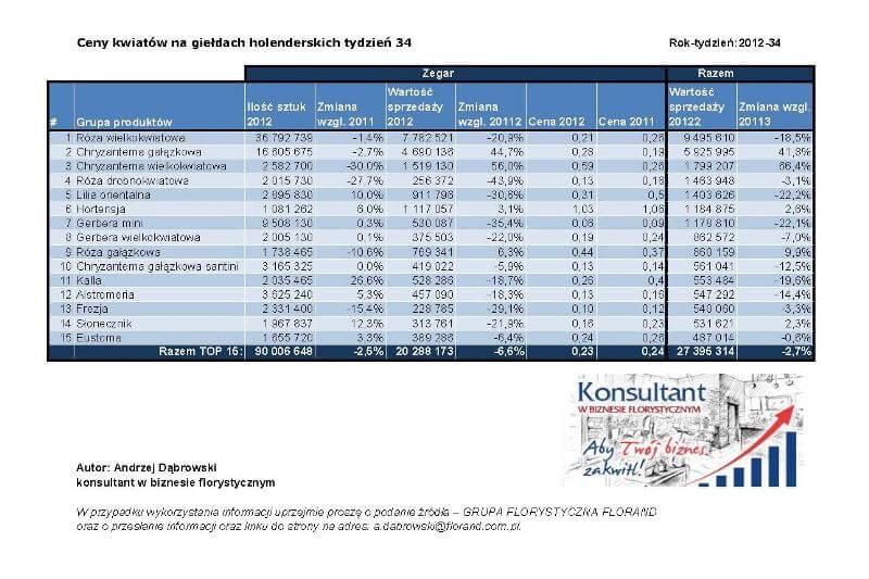 Dla polskich florystów pocieszające jest to, że w tym tygodniu ograniczą zakupy kupcy z Rosji, którzy w ostatnim tygodniu zdominowali giełdy holenderskie, gdyż zaspakajali wzmożony popyt na kwiaty rosyjskich klientów w związku z rozpoczynającym się rokiem szkolnym. Tym zamyka się nasza analiza cen kwiatów.