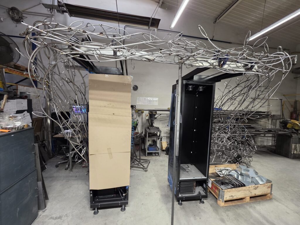 Ostatnim elementem projektu, swoistą „kropką nad i”, był kaseton reklamowy. Jego kształt i proporcje to temat, który wymagał wielu rozmów i prób. Czy powinien biec przez całą długość maszyny, tworząc wyraźną, mocną linię? A może lepiej, by subtelnie obejmował tylko centralną część, podkreślając formę i symetrię projektu? W grę wchodziły różne warianty – od minimalistycznego prostokąta po lekko zaokrągloną formę, z delikatnym podświetleniem lub złotym detalem. Ostatecznie kaseton stał się wisienką na torcie, spajając całość projektu i nadając mu charakteru. To właśnie ten element dopełnił wizualną harmonię między technologią a sztuką.