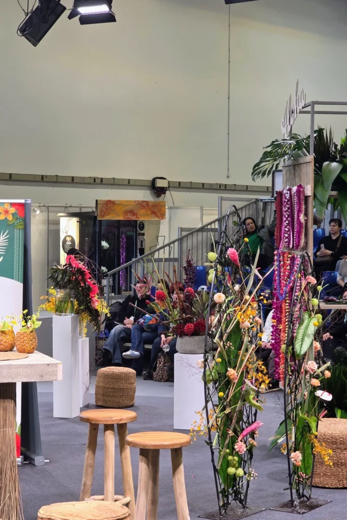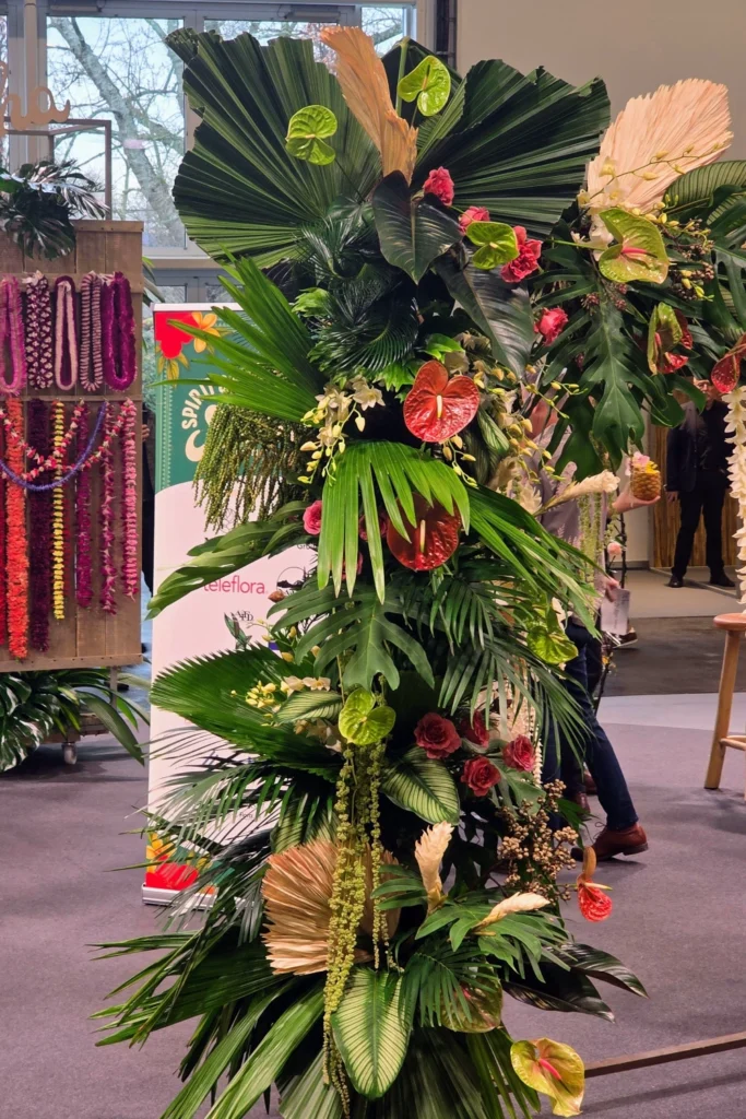 Tropikalne kompozycje florystyczne podczas pokazu Spirit of Aloha na IPM ESSEN 2026, realizowanego przy wsparciu BouquetMat jako profesjonalnego zaplecza i witryny ekspozycyjnej.